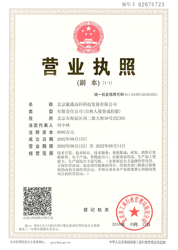 北京融通高科科技發(fā)展有限公司成立于2002年8月15日,注冊資本為8000萬元人民幣,在北京中關村上地信息產(chǎn)業(yè)基地擁有獨棟研發(fā)樓,是國家級高新技術企業(yè)、雙軟企業(yè)、集成電路設計企業(yè)、國家密碼管理局指定生產(chǎn)商用密碼產(chǎn)品的定點企業(yè),具備IC卡及IC卡讀寫機具生產(chǎn)資質的企業(yè),2005年公司通過了ISO9001認證,自2011起連續(xù)多年入選中關村國家自主創(chuàng)新示范區(qū)50強100優(yōu)高新技術企業(yè)。