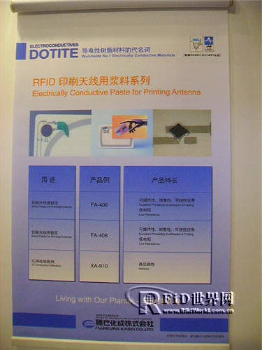 據(jù)藤倉化成株式會社高橋事業(yè)部長介紹,該司以 DOTITE®商標(biāo)注冊的導(dǎo)電性樹脂材料產(chǎn)品,是于1957年成功開發(fā),日本首家實現(xiàn)上市銷售的同類型產(chǎn)品。至今已被廣泛應(yīng)用于包括IC卡在內(nèi)的數(shù)百種不同用途的產(chǎn)品中,甚至在美國阿波羅計劃中也有被應(yīng)用。而在本次展會中展出的DOTITE FA-406/FA-408產(chǎn)品,是可以在PET,或紙質(zhì)基材上,以高速印刷的方法進(jìn)行RFID天線印刷的導(dǎo)電性漿料產(chǎn)品。