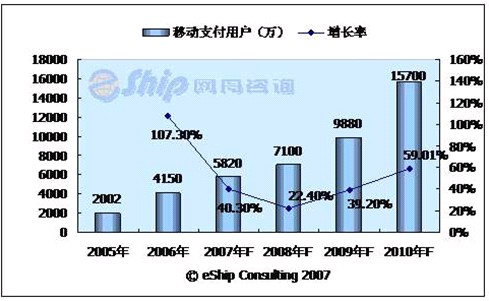 移動(dòng)支付,也稱(chēng)為手機(jī)支付,是允許用戶使用其移動(dòng)終端(通常是手機(jī))對(duì)所消費(fèi)的商品或服務(wù)進(jìn)行賬務(wù)支付的一種服務(wù)方式。據(jù)調(diào)查數(shù)據(jù)表明:預(yù)計(jì)在2010年,移動(dòng)支付在中國(guó)用戶總數(shù)將突破1.5億,從2006年到2010年的年均復(fù)合增長(zhǎng)率為18.54%。