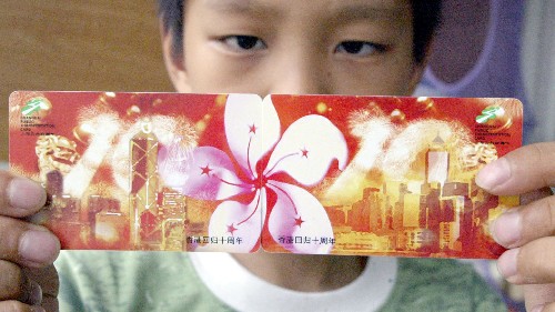 為慶祝香港回歸十周年,上海公共交通卡公司特別發(fā)行了一套兩張“香港回歸紀(jì)念交通卡”。