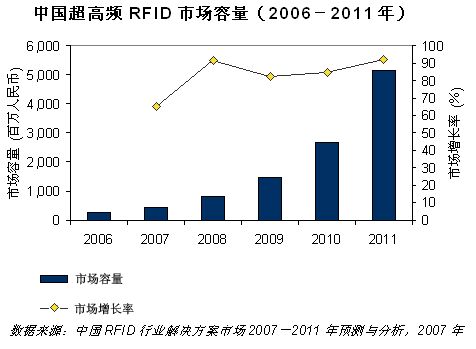 據(jù)IDC最新發(fā)布的報告《中國RFID行業(yè)解決方案市場2007-2011年預(yù)測與分析》顯示,2006年RFID跨行業(yè)應(yīng)用總體市場規(guī)模為24.2億元(約3.02億美元),涵蓋的應(yīng)用領(lǐng)域包括供應(yīng)鏈、人員、財產(chǎn)、車輛管理,門禁控制、防偽、動物識別等,其中超高頻RFID應(yīng)用市場規(guī)模占RFID總體應(yīng)用規(guī)模的10.4%。2006年的超高頻市場在供應(yīng)鏈、車輛管理等方面實現(xiàn)了更多的卓有成效的試驗項目,而且在機(jī)場行李跟蹤等實際應(yīng)用上正在形成成熟的解決方案。IDC預(yù)計到2011年超高頻RFID市場規(guī)模將達(dá)到51.5億元(約6.42億美元),未來五年復(fù)合平均增長率達(dá)82.8%。