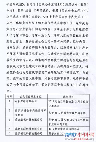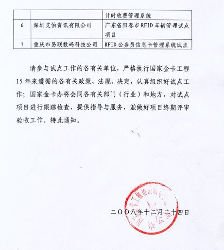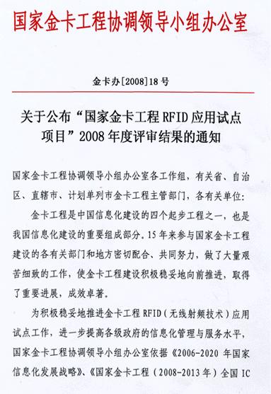國家金卡工程RFID應(yīng)用試點項目2008年審批通知