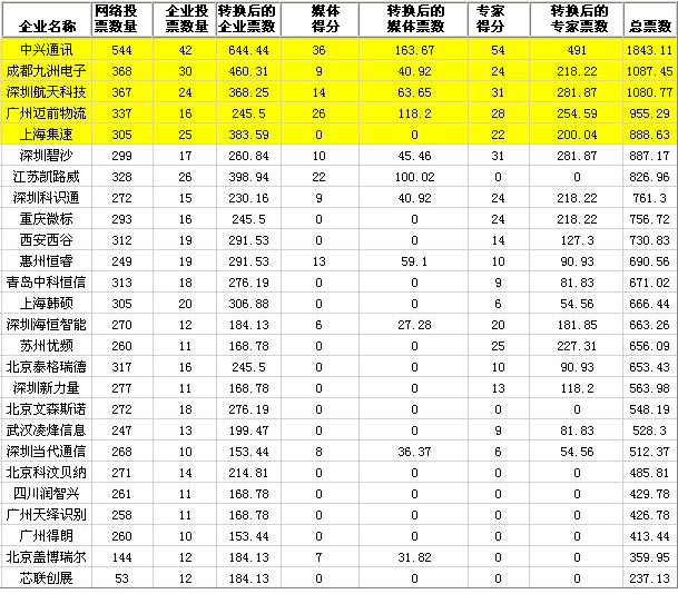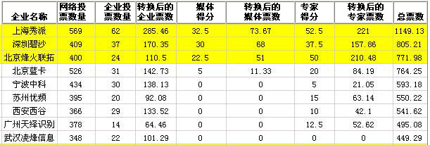 媒體代表投票名單 、專家投票名單 、企業(yè)代表投票名單 、網(wǎng)絡目前的投票結果、評選計分公式說明
