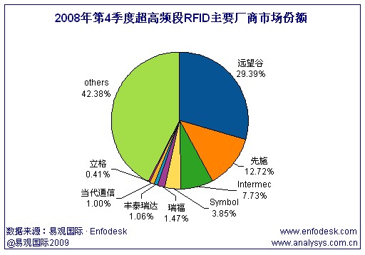 根據(jù)易觀Enfodesk近期發(fā)布《2008年第4季度中國RFID市場季度監(jiān)測》數(shù)據(jù)顯示,中國RFID市場2008年第4季度市場規(guī)模達(dá)到26.3億元人民幣,相較上一季度增長了25.8%。其中超高頻市場規(guī)模為3.23億元,環(huán)比增長64.8%,增長的主要原因是國家在鐵路市場投資加速,除此之外,很多項目的回款集中在年底,使得本季度超高頻領(lǐng)域市場有快速增長。