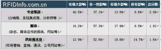 超過40%的最終用戶指出,在對(duì)RFID技術(shù)供應(yīng)商形成認(rèn)識(shí)的過程中,分銷商、集成商和分析師會(huì)有“很大的影響”。這個(gè)數(shù)字是受供應(yīng)商本身影響較大的最終用戶人數(shù)的3倍。下面的表格更加具體的說明了最終用戶對(duì)RFID技術(shù)供應(yīng)商的認(rèn)知是如何被影響的。值得注意的是,媒體也比直接供應(yīng)商的溝通更有影響力。