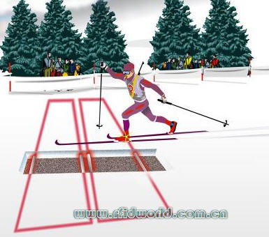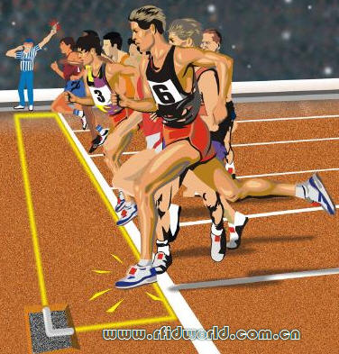 對(duì)于在田徑場、滑冰場等場內(nèi)進(jìn)行的中、長距離比賽,運(yùn)動(dòng)員要在場內(nèi)行進(jìn)幾圈到幾十圈,需要記錄運(yùn)動(dòng)員行進(jìn)的圈數(shù),以便確認(rèn)運(yùn)動(dòng)員是否跑完全程。為此在終點(diǎn)線安裝一套系統(tǒng)天線及讀卡器,并給每個(gè)運(yùn)動(dòng)員攜帶能發(fā)出不同特征信息的感應(yīng)卡,當(dāng)運(yùn)動(dòng)員聽到發(fā)令槍聲,起跑后,運(yùn)動(dòng)員每經(jīng)過一次終點(diǎn)線時(shí),位于終點(diǎn)線處的天線接收到運(yùn)動(dòng)員攜帶的感應(yīng)卡發(fā)出的信號(hào),經(jīng)讀卡器處理后,識(shí)別出該位運(yùn)動(dòng)員的身份,并記錄下相應(yīng)圈數(shù),從而完成了自動(dòng)記錄所有參賽運(yùn)動(dòng)員行進(jìn)圈數(shù)的目的。