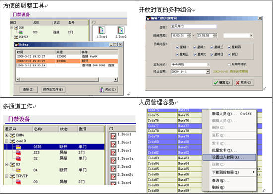 人員照片支持粘貼、復(fù)制功能;實(shí)時(shí)事件支持全屏幕;工程安裝有調(diào)試界面;支持多種發(fā)卡方式。