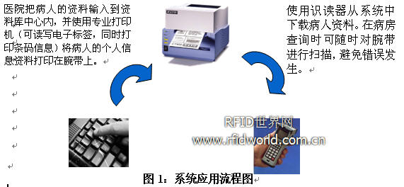 醫(yī)院把病人的資料輸入到資料庫(kù)中心內(nèi),并使用專業(yè)打印機(jī)(可讀寫電子標(biāo)簽,同時(shí)打印條碼信息)將病人的個(gè)人信息資料打印在腕帶上。 使用識(shí)讀器從系統(tǒng)中下載病人資料。在病房查詢時(shí)可隨時(shí)對(duì)腕帶進(jìn)行掃描,避免錯(cuò)誤發(fā)生。