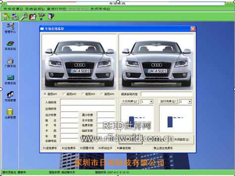系統(tǒng)還在停車場的出入口各安裝一臺高解析度彩色攝象機、固定支架、自動光圈,可24小時監(jiān)視車輛出入情況,可看清車牌。當有車進停車場,刷卡時將啟動入口攝象機抓拍圖象傳送到電腦,存入數(shù)據(jù)庫中;當有車輛駛離車場時,車輛除應交納必要的停車費用外,駛離車輛的所以資料(車牌、型號、顏色等)都必須與進來的資料對比相同,閘桿才抬起,則可通行。