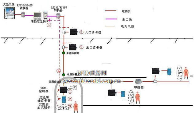 ⑥ 地面中心站根據(jù)安裝的礦井考勤定位管理軟件判斷出SDML安全型識別卡的具體信息(如:是誰,在哪個位置,具體時間),同時可將信息顯示在控制中心的大屏幕或電腦顯示屏上,并做好備份。