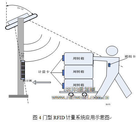 在廣西鞋業(yè)的RFID生產(chǎn)制程管控一期實施中,使用了RFID技術進行各工序的計量。其方案如下:在半成品區(qū)前面有RFID計量系統(tǒng),系統(tǒng)的RFID讀寫設備與計算機通過以太網(wǎng)連接。當某個班組完成一定數(shù)量的半成品加工后,將規(guī)定數(shù)量半成品放置在半成品周轉箱內(nèi),并在箱上掛計量卡(每張標簽代表一定批次及數(shù)量),執(zhí)行周轉操作的員工同時佩帶班組卡,在經(jīng)過RFID計量系統(tǒng)進入半成品區(qū)時,操作員工首先通過門型計量系統(tǒng),確認RFID讀寫設備識別到班組卡后,再回來拖動周轉箱通過統(tǒng)計門,RFID讀寫設備識讀所有批量卡。讀寫設備連接的計算機將識讀的班組卡和計量卡信息按對應關系上傳給ERP管理系統(tǒng)。
