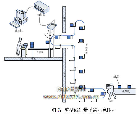 在工廠的生產(chǎn)線工序流程中,成型線的末端連接一個機械傳送機構,該機構將成型線完成的成品傳送到成品倉庫。在傳統(tǒng)的流程中使用人工統(tǒng)計數(shù)量,但實際情況中同一天的生產(chǎn)可能有不同批次的成品交替,甚至有返工的批次摻雜在常規(guī)批次中,因此經(jīng)常發(fā)生統(tǒng)計錯誤。該流程的信息化改造有使用條碼掃描方案,但是因為同一批次中同規(guī)格鞋子的條碼一般相同,因此使用條碼可能發(fā)生多次掃描以及漏掃的情況。在一期的RFID生產(chǎn)制程管控方案中使用RFID技術來實現(xiàn)計量統(tǒng)計。