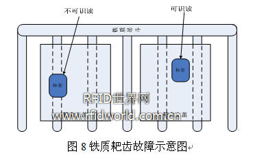 1:傳送機構的吊斗為鐵質耙齒,而原有流程中會放置在鞋盒的底部,計量卡會有一定概率貼在耙齒上,因鐵質背景對RFID標簽的固有影響造成無法識讀,導致漏讀現(xiàn)象。