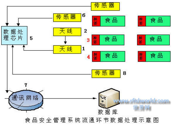 電子標簽閱讀器1開始工作后,向天線2發(fā)出讀標簽3的指令,食品4上的電子標簽3在接收到天線2發(fā)出的無線電波能量后,向天線2發(fā)出序號信息,天線2接收此信號,并把此信號傳送給閱讀器1,閱讀器對接收到得信號進行相應(yīng)的處理后埋在傳送給集成在閱讀器中的數(shù)據(jù)處理芯片5,于此同時,分布在本流通環(huán)節(jié)中的各個傳感器6分別把測量的周圍環(huán)境信息業(yè)發(fā)送給數(shù)據(jù)處理芯片5,數(shù)據(jù)處理芯片5對接收到得信息進行綜合處理,然后通過通信網(wǎng)絡(luò)7把處理結(jié)果發(fā)給食品安全數(shù)據(jù)庫8.