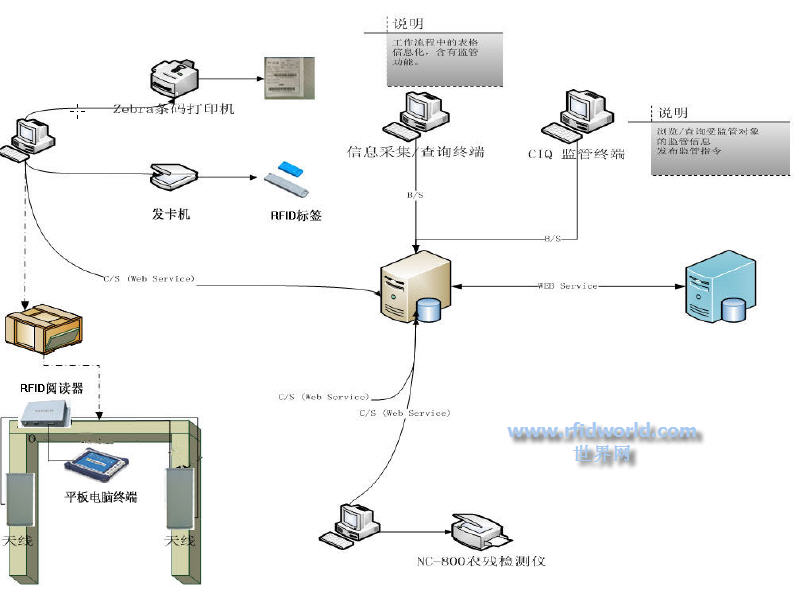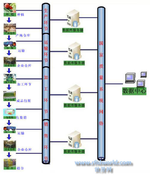 RFID是一種非接觸式的自動識別技術(shù),它通過射頻信號自動識別目標對象并獲取相關(guān)數(shù)據(jù),結(jié)合有效的數(shù)據(jù)庫系統(tǒng)及網(wǎng)絡(luò)體系,可以實現(xiàn)全球范圍內(nèi)物品的跟蹤與信息共享。RFID技術(shù)具有識別工作無需人工干預(yù)、批量遠距離讀取、對環(huán)境要求低、使用壽命長、數(shù)據(jù)可加密、存儲信息科更改等優(yōu)點,其應(yīng)用將給食品安全追溯管理帶來本質(zhì)的變化。