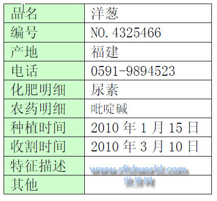 可為每一個地塊或一個品種設(shè)定一個標簽,對該地塊或該品種蔬菜從種植到打包實施的整個過程中的必要信息通過讀入或輸入設(shè)備進行及時初始信息的錄入,如蔬菜品種、生長時間、噴施農(nóng)藥的名稱及次數(shù),使用的化肥、收割時間等,甚至包括該品種的特點描述,根據(jù)農(nóng)產(chǎn)品編碼標準,對每一類蔬菜設(shè)置一個編號作為其身份的唯一標識。這樣在該品種蔬菜完成供應(yīng)鏈的第一個環(huán)節(jié)時,該電子標簽已經(jīng)存儲了其所有基本信息。當(dāng)收購企業(yè)對任何一個地塊的蔬菜品種收購時,通過采用數(shù)據(jù)采集器對農(nóng)產(chǎn)品以及農(nóng)產(chǎn)品進行信息采集,不僅加快了收購速度,降低了出錯率,而且為農(nóng)產(chǎn)品加工企業(yè)提供了POS系統(tǒng)、EDI(電子通關(guān)系統(tǒng))、藥物殘留測試系統(tǒng)、電子商務(wù)等系統(tǒng)的基礎(chǔ)數(shù)據(jù),為產(chǎn)品溯源提供源頭數(shù)據(jù)。以某地某種植基地的洋蔥為例,其電子標簽包含的內(nèi)容如圖