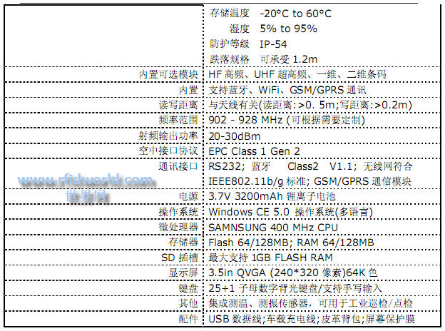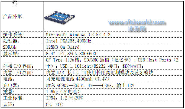 通訊接口 RS232;藍牙Class2 V1.1;無線網(wǎng)符合IEEE802.11b/g標準; GSM/GPRS通信模塊