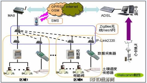 解決方案 如圖所示,首先在灌溉區(qū)域用Helicomm的IP-Link2220架設(shè)出無線mesh網(wǎng),每一個(gè)IP-Link2220連接一個(gè)區(qū)域的控制器和電磁閥,控制這個(gè)區(qū)域的灌溉,最后連接到Master(IP-Link2220)和GPRS,GPRS與遠(yuǎn)端PC通過GPRS網(wǎng)絡(luò)和Internet互聯(lián),從而實(shí)現(xiàn)灌溉的遠(yuǎn)程控制。另外此系統(tǒng)的主要目的在于節(jié)約灌溉用水,提高灌溉效率,所以在灌溉區(qū)域最好配置田間濕度傳感器與接入mesh網(wǎng)的IP-Link2220(或GPRS)相連,以便遠(yuǎn)端控制室能夠采集灌溉區(qū)域的土壤濕度信息,配合氣象站的氣象信息,對(duì)灌溉時(shí)間做出合理的判斷,進(jìn)而達(dá)到高效節(jié)水灌溉的目的。