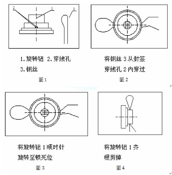 注:在電子簽封的安裝過程中,操作人員應(yīng)嚴(yán)格按照操作步驟進(jìn)行,一定要讓鋼絲的兩端都穿過穿線孔之后,然后旋轉(zhuǎn)旋轉(zhuǎn)鈕至鎖死位,最后掰斷或剪斷旋轉(zhuǎn)鈕。