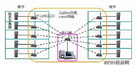 解決方案 如圖所示,在樓宇內布置由溫度采集器和ZigBee無線數(shù)傳終端組成的溫度采集點,采集的溫度數(shù)據(jù)通過IP-Link2220所組成的ZigBee無線mesh網(wǎng)絡把各處的溫度數(shù)據(jù)傳回中心端。中心端可根據(jù)各方采集的數(shù)據(jù)進行合理判斷,保持取暖用戶室內溫度均衡穩(wěn)定,有效利用煤炭等取暖資源。溫度采集點架設靈活,可根據(jù)具體需求和項目成本靈活架設。