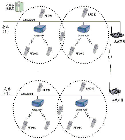 系統(tǒng)應(yīng)用以集中服務(wù)為核心,針對于倉儲管理的需求,移動節(jié)點(diǎn)之間無須通信,在現(xiàn)場內(nèi)部以無線RF網(wǎng)絡(luò)拓?fù)浣Y(jié)構(gòu)為訪問節(jié)點(diǎn)連接型。RF移動終端的操作區(qū)域遍及商店的各個角落,要求移動終端在商店內(nèi)部的任何地點(diǎn),都能和服務(wù)器主機(jī)保持實(shí)時的通訊。因此,在系統(tǒng)網(wǎng)絡(luò)架構(gòu)中,必須保證安裝的 AP 點(diǎn)能對整個商店進(jìn)行無線信號的全覆蓋。如果商店的面積較大,在進(jìn)行無線網(wǎng)絡(luò)設(shè)計(jì)時,可以充分利用無線RF技術(shù)的網(wǎng)絡(luò)擴(kuò)展能力和無縫漫游特性,對商店的無線信號進(jìn)行多個AP 點(diǎn)的組合,即通過設(shè)置多個AP節(jié)點(diǎn),作到信號的全覆蓋,而且相鄰AP之間互為冗余,提高無線網(wǎng)絡(luò)的可靠性。同時考慮到大型倉儲商店的辦公區(qū)可能與賣場不在同一區(qū)域,而且不便使用有線網(wǎng)絡(luò)連接,因此商店與辦公區(qū)之間可以采用無線網(wǎng)橋連接,使之成為統(tǒng)一的網(wǎng)絡(luò)體系,便于網(wǎng)絡(luò)的擴(kuò)展和拆除。