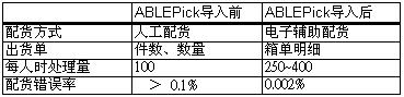 摘要:ABLEPick 是一套電子標(biāo)簽輔助揀貨系統(tǒng)(Digital Picking System),電子標(biāo)簽輔助揀貨系統(tǒng)于國、內(nèi)外物流中心在揀貨作業(yè)上的使用相當(dāng)普遍,特別是對于多樣少量的揀貨型態(tài)。