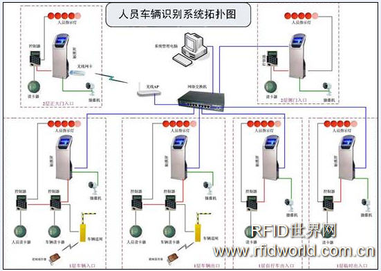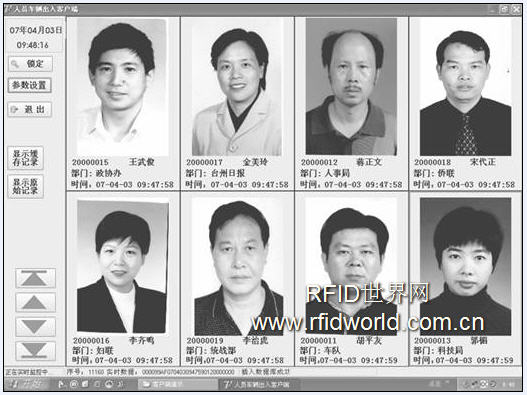 首先在大樓的所有工作人員經(jīng)過的通道安放若干個信號收發(fā)器(基站式讀卡器)、控制器、攝像機、觸摸屏(PC工作站),并且將它們通過網(wǎng)絡布線和控制中心的管理計算機聯(lián)網(wǎng)。同時為每個大樓內(nèi)的工作人員發(fā)放一個信號感應器(有源電子標簽),當工作人員進出各個出入口的時候,只要通過或接近放置在通道內(nèi)的任何一個信號收發(fā)器,信號收發(fā)器會感應到電子標簽信號同時立即上傳到控制器中,控制器根據(jù)接收到的電子標簽的編號和數(shù)量做相應的動作(如顯示指示燈的數(shù)量和顏色)同時上傳給工作站的PC(觸摸屏),工作站PC根據(jù)收到的標簽編號結(jié)合數(shù)據(jù)庫內(nèi)儲存的人員資料信息在屏幕上顯示相關人員的信息和照片。