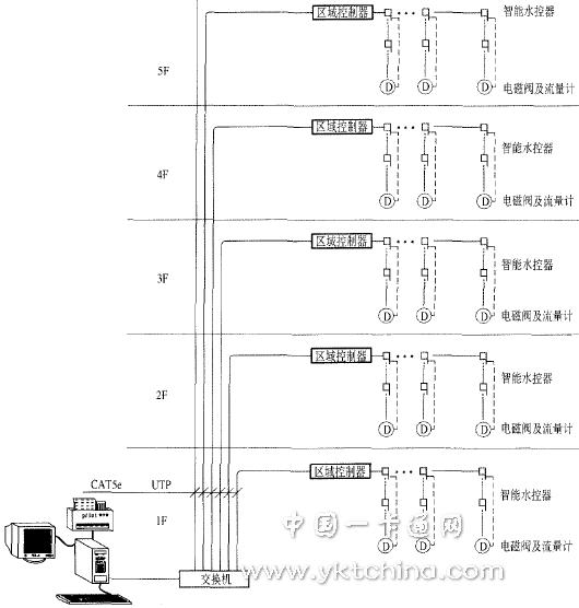每層樓的弱電間內(nèi)安裝一個區(qū)域控制器 每幢樓的區(qū)域控制器通過一個交換機接入學校“一卡通”主干網(wǎng) 與上層清算系統(tǒng)進行數(shù)據(jù)交換。每個區(qū)域控制器可掛3條RS485總線,但為施工方便 在本項目實際中只需用到兩條即可,左右每條RS485線非別上”手拉手”接入20個智能節(jié)水控制器。每個節(jié)水控制器上再外接水表、電磁閥等設備 完成對寢室用水的控制。安裝示意圖見圖3。