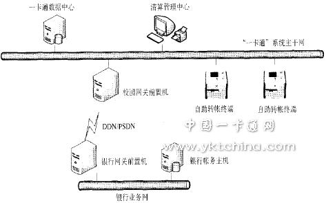 該系統(tǒng)為項目后期擴展功能系統(tǒng),可以將銀行卡賬戶的手工現(xiàn)金存款模式 改為通過持卡人銀行賬戶自動轉(zhuǎn)賬或自助轉(zhuǎn)賬的存款模式,以給師生使用一卡通系統(tǒng)帶來更大的便利。本系統(tǒng)需要銀行方面根據(jù)轉(zhuǎn)賬系統(tǒng)的數(shù)據(jù)接口和通信協(xié)議 建立相應的轉(zhuǎn)賬業(yè)務,兩大系統(tǒng)通過銀行網(wǎng)關前置機發(fā)起轉(zhuǎn)賬請求到學校網(wǎng)關前置機,經(jīng)過DDN專線實現(xiàn)系統(tǒng)之間賬戶資金轉(zhuǎn)賬、賬務結(jié)算。見圖4。