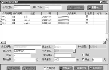 發(fā)卡本著一人一卡的原則。發(fā)卡管理系統(tǒng)包括操作員權(quán)限管理、人事管理、卡片管理、通訊管理及數(shù)據(jù)備份與恢復(fù)等功能模塊。
