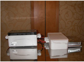 因為晶圓盒進出搬運時采紙箱包裝,有兩個或一個晶圓盒裝成一個紙箱中,并堆棧于棧版上,因此我們需尋找能夠容納南茂棧版寬度通過且能達到讀取卷標的天線。依照南茂棧版寬度120cm要求下,我們測試德國FEIG LR2000型號RFID讀取器與天線(圖4)發(fā)現(xiàn)他的有效讀取距離可以達到160cm,因此我們設定在140cm作為閘門寬度(圖5),一方面可以顧及到RFID讀取率,另一方面也不會因閘門天線的架設而影響原先廠內(nèi)設備移動的動線規(guī)劃。