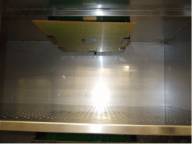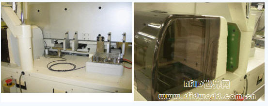 因此當南茂導入RFID技術后,首先可以取代工作流程清單的角色,經(jīng)由RFID標簽編號可以串起晶圓盒相關作業(yè)信息,同時經(jīng)由儲存于信息系統(tǒng)之中,減少無塵紙張成本的支出。另外就是取代人工輸入測試晶圓批號參數(shù),改由RFID感應晶圓盒上卷標信息自動輸入測試系統(tǒng),下載測試程序,減少人為錯誤輸入所引起的問題。在這里我們采用FEIG MR200接上天線板,此天線板固定于測試機臺承載測試晶圓置放處(圖18、19),當測試晶圓進行測試時,晶圓仍置放于晶圓盒內(nèi)層拖盤上,整個內(nèi)層拖盤會置入測試機臺之中,故內(nèi)層拖盤上的RFID標簽會被感應回報晶圓相關信息給測試系統(tǒng)。