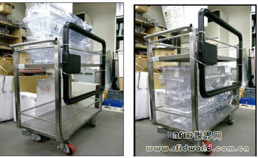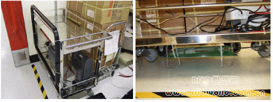 當晶圓盒在手推車時,依南茂規(guī)定晶圓盒不可以相迭,所以依南茂廠內(nèi)最常使用手推車設計時,一臺手推車最多可以放五個晶圓盒,比原先未導入RFID技術時,少掉一個晶圓和位置,原因是需要位置擺放RFID讀取器、電池、天線分配器等設備。針對手推車應用,我們選擇MR200WiFi版本,同時為能將手推車上晶圓盒標簽讀取到外,還需能定出手推車停于何處。首先解決手推車上晶圓盒的讀取,我們采用FEIG 一款80cmX60cm 規(guī)格之天線,同時將天線固定在手推車的側(cè)邊(圖14),以利上、下兩層晶圓盒讀取,其測試結果皆能完全正確讀取。