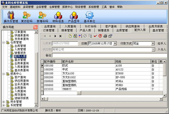 配件入庫界面。