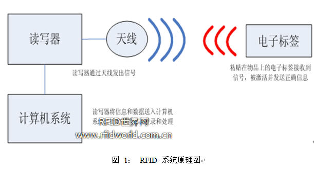 RFID系統(tǒng)由讀寫器、電子標(biāo)簽及應(yīng)用軟件系統(tǒng)三個(gè)部分所組成,如圖1所示。其工作原理是:讀寫器發(fā)射特定頻率的無線電波給電子標(biāo)簽,用以驅(qū)動電子標(biāo)簽電路將內(nèi)部的數(shù)據(jù)送出,此時(shí)讀寫器便依序接收解讀數(shù)據(jù),送給應(yīng)用軟件做相應(yīng)的處理。