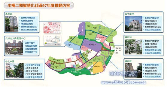 計畫于臺北市木柵二期重劃區(qū)五個居住社區(qū)以及一所老人安養(yǎng)護中心建置了「智慧巡房小幫手」、「活動履歷服務(wù)」、「智慧型門禁管家」、「智慧型壁掛資訊站」、以及「社區(qū)安全巡邏服務(wù)」等五項RFID建置系統(tǒng),使其正式成為全亞洲第一座RFID智慧化便利社區(qū),讓社區(qū)居民能在RFID的安全網(wǎng)絡(luò)之下,享受更優(yōu)質(zhì)的智慧化生活。