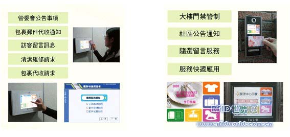 另外,在社區(qū)居住的部分,則引進了「智慧型門禁管家」系統(tǒng),整合「智慧型壁掛資訊站」的建置,利用RFID帶來的高科技來做社區(qū)的管理員。此套系統(tǒng)不但能讓住戶透過觸碰式螢?zāi)唬涂芍苯幼x取鄰居或訪客的留言,更能成為住戶居家的小幫手,例如,王先生想要修理家中的瓦斯管線,只需要利用RFID辨識并透過前述智慧型設(shè)備即可通知管理室請求維修。相關(guān)的維修處理進度,住戶不但可透過網(wǎng)路線上查詢,也能透過RFID的身分辨識,靠卡即可完成所有查詢動作!