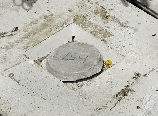 RFID無線射頻標示系統(tǒng)的感應晶片條碼內(nèi)嵌在圓型水泥盤內(nèi),上面為即為該人手孔的檔案編號。