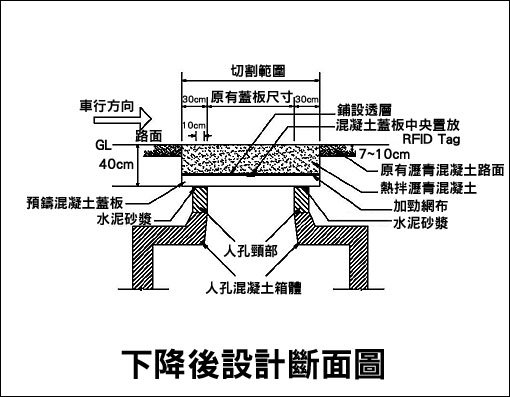 而在回填瀝青混凝土埋設人手孔前,為利于道路更性后仍能精準辨識人手孔位置,此次工程單位將為每個人手孔蓋埋設RFID無線射頻標示系統(tǒng),日后工程人員只要藉由RFID探測器就能精準找到獨立編號建檔的路面下人手孔位置。最后,既然人手孔已經(jīng)調(diào)降至15公分以下,施工廠商最后將可依設計高程與銑刨厚度(10公分)進行全面更換路面的施工,完工后,僅降低15公分的人手孔將距離路面仍有5公分厚的瀝青混凝土,代表傳統(tǒng)外露的人手孔蓋多數(shù)將隱沒于路面下方,如此一來,對路面平整度將有顯著的提升。