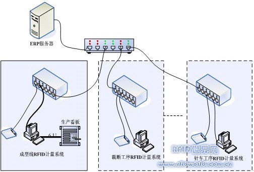 1.在裁斷,針車,大底等半成品工序,當某個生產班組生產完一定數量的半成品后,要求將其放置到指定的半成品區(qū)供下一工序領用。在RFID集成應用中流程為操作員工將規(guī)定數量半成品放置在周轉箱內,并在周轉箱上掛上存儲有批次信息的RFID標簽(計量卡),同時操作的工人身上佩帶稱為班組卡的具有本組標識的RFID標簽,當通過半成品區(qū)的RFID計量系統(tǒng)時,RFID系統(tǒng)自動識別計量卡和班組卡,并將數據實時導入給ERP系統(tǒng)。