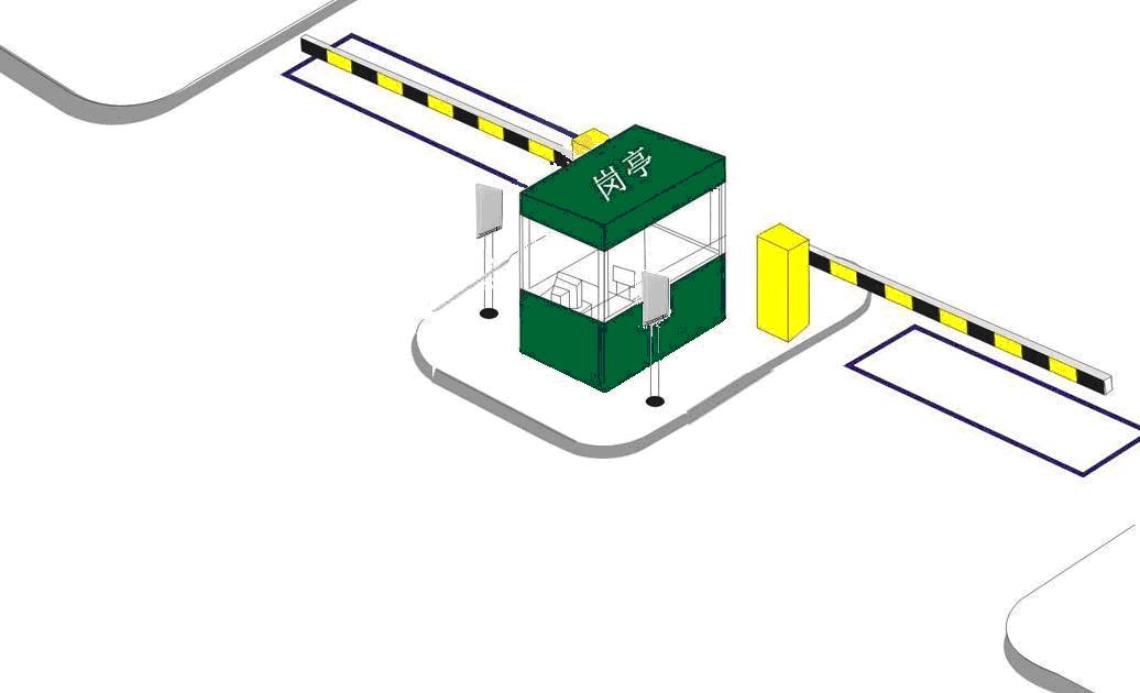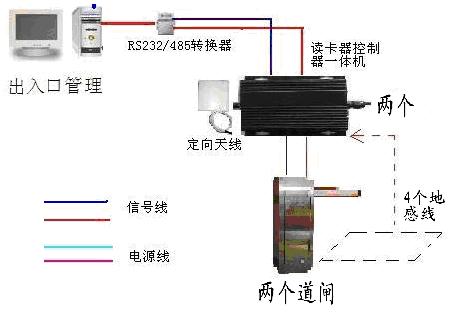 總出入口(一進(jìn)一出分開式,口的間距為15m)方案共計使用2個讀感器、電腦1臺、道閘2個、軟件一套及配套安裝件來實現(xiàn),