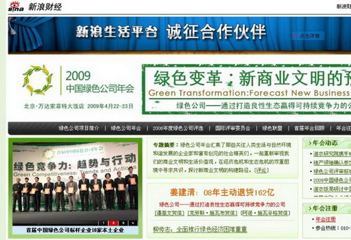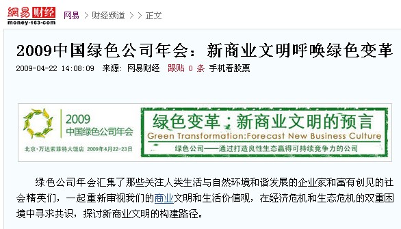 4月22日至23日,由中國企業(yè)家俱樂部、道農研究院、《綠公司》雜志主辦的“2009中國綠色公司年會”在北京召開。4月22日是第40個世界地球日,去年的這一天舉辦了第一屆中國綠色公司年會。本屆年會以“綠色變革:新商業(yè)文明的預言”為主題,在世界陷入經(jīng)濟危機和生態(tài)危機的雙重困境中,力求以一種系統(tǒng)性思維為商業(yè)世界發(fā)現(xiàn)正確的方向和動力,尋求危機的根本性解決方案和可持續(xù)發(fā)展之路。