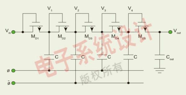 Dickson電荷泵幾乎可用任何半導(dǎo)體器件來構(gòu)建,但采用肖特基二極管和低閾值電壓( VTH ) MOSFET的設(shè)計(jì)具有最佳性能。Dickson電荷泵電路要求輸入電壓很小,設(shè)計(jì)工程師可以通過控制級數(shù)(N)來選擇想要的輸出電壓和輸入阻抗。但由于整流器件數(shù)量多,并存在泄漏電流和寄生參數(shù),Dickson電荷泵的功率轉(zhuǎn)換效率較低。