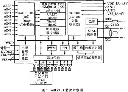 nRF24E1是一種工作頻率可達(dá)2.4GHz的無線射頻收發(fā)芯片。內(nèi)部嵌有與8051兼容的微控制器和10位9輸入的A/D轉(zhuǎn)換器,可以在