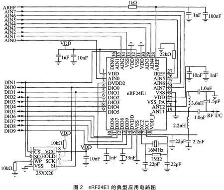 圖2為nRF24E1的典型應(yīng)用電路。從圖中看到,采用Nordic nRF24E1無線單片機(jī)芯片設(shè)計(jì)的線路非常簡單,外圍零件很少,也非常容易進(jìn)行設(shè)計(jì)開發(fā)。