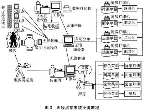 單打印和數(shù)據(jù)無線傳輸至收銀用機(jī)、傳菜用機(jī);根據(jù)所得數(shù)據(jù),收銀機(jī)結(jié)賬并打印賬單,傳菜機(jī)打印、傳菜、劃單,最后由服務(wù)員完成送菜、上菜。