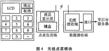 ③終端點(diǎn)菜。顧客通過無線發(fā)送/接收終端實(shí)現(xiàn)點(diǎn)菜,點(diǎn)菜后確認(rèn)完成。
