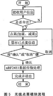 用戶完成點(diǎn)菜后,無線點(diǎn)菜終端會將點(diǎn)菜數(shù)據(jù)傳輸給遠(yuǎn)程服務(wù)器,并給出"您已成功點(diǎn)菜!"的顯示信息,用戶此時(shí)可以退出系統(tǒng)。對于餐廳外的外賣點(diǎn),5 min內(nèi)用戶不再進(jìn)入系統(tǒng)修改或取消點(diǎn)菜信息則自動從用戶卡中扣款完成結(jié)賬,并在指定時(shí)間內(nèi)為用戶烹制好所點(diǎn)菜肴送到指定位置。