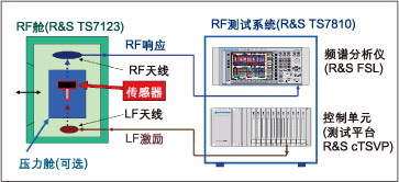 壓力艙模擬RF測(cè)試艙內(nèi)部的胎壓。一個(gè)波形發(fā)生器以125kHz LF數(shù)據(jù)電報(bào)激勵(lì)胎壓傳感器發(fā)送數(shù)據(jù)(ID號(hào)碼、壓力和溫度)。該RF數(shù)據(jù)電報(bào)由測(cè)試艙中的ISM天線拾取并在頻譜分析儀中解調(diào)。其系統(tǒng)軟件可評(píng)估該信息并給出GO/NoGo信息。