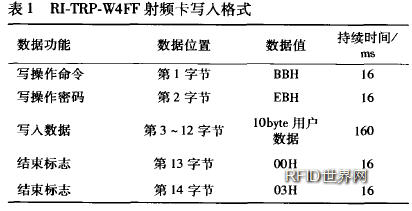 選用的卡片封裝的RI—TRP—W4FF射頻卡為可讀/寫型,其中共有14bytes位數(shù)據(jù)存儲空間[3]。讀出格式:① 第1字節(jié)為起始字節(jié),固定值為FEH;② 第2— 11字節(jié)為用戶數(shù)據(jù)區(qū);③ 第12字節(jié)為停止字節(jié)。固定值為FEH;④ 第l3,l4字節(jié)內(nèi)數(shù)據(jù)值分別等于第2,3字節(jié)內(nèi)數(shù)據(jù)值.寫入格式如表1所示: